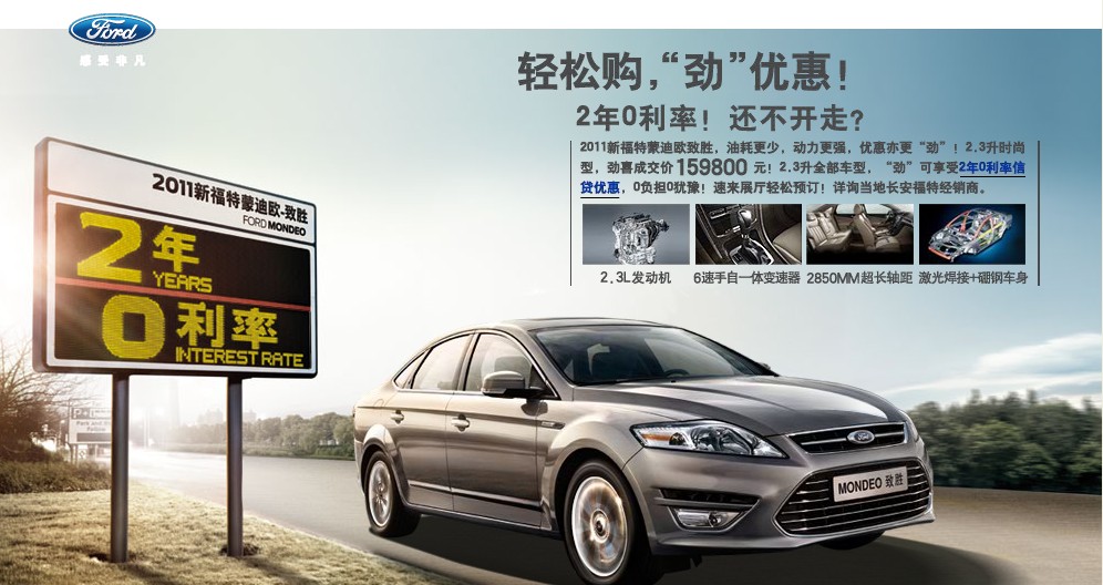2011新福特蒙迪歐-致勝,油耗更少,動力更強,優(yōu)惠更“勁”!2.3升時尚型,驚喜獎僅15.98萬元!2.3升全部車型,“勁”可享受2年0利率信貸優(yōu)惠,0負(fù)擔(dān)0猶豫!速來展廳輕松預(yù)訂!