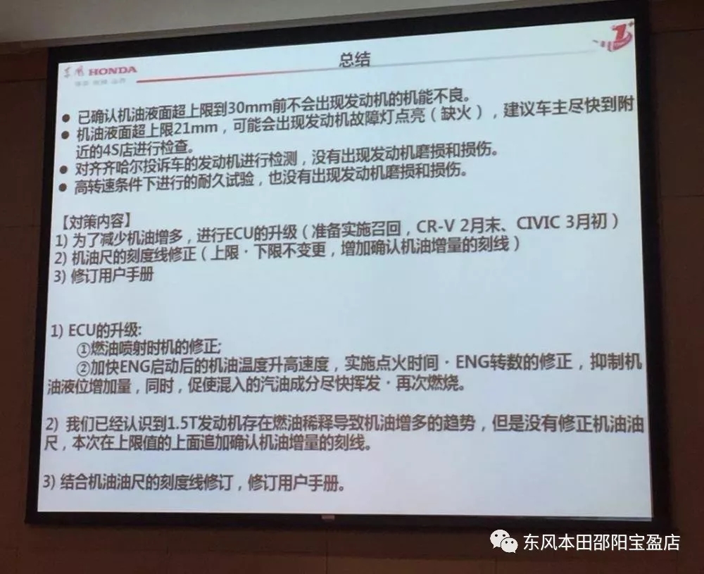 今日東風(fēng)本田官方正式公布關(guān)于1.5T發(fā)動(dòng)機(jī)機(jī)油液位升高的相關(guān)問題的調(diào)查報(bào)告,并公布解決方案。東風(fēng)本田宣布,為了減少機(jī)油增多,進(jìn)行ECU升級(jí)(準(zhǔn)備實(shí)施召回,CR-V在2月末、CIVIC在3月初);機(jī)油尺的刻度線修正,上限下限不變更,增加確認(rèn)機(jī)油增量的刻線;修訂用戶手冊(cè)。
