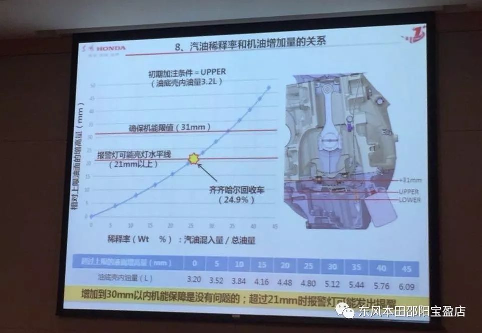 報(bào)告中稱,當(dāng)機(jī)油超標(biāo)尺上限31mm時(shí),出現(xiàn)油壓波動(dòng)、PCV通道被堵塞,無法保證發(fā)動(dòng)機(jī)技能。從汽油稀釋率和機(jī)油增加量的關(guān)系來看,而增加到30mm以內(nèi)機(jī)能保障是沒有問題的,超過21mm時(shí)報(bào)警燈可能發(fā)出提醒。