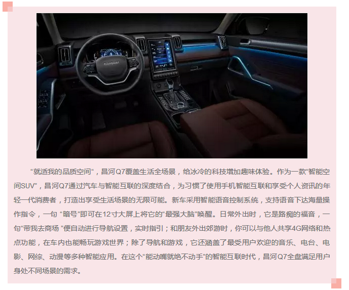 昌河Q7定位為“智能空間SUV“,為充滿活力的,喜歡表達自我、享受當(dāng)下,更渴望嘗試新鮮事物的年輕一代消費者量身打造,新車打出“就適我的空間”這一鮮明產(chǎn)品主張,旨在為互聯(lián)網(wǎng)下的新世代年輕人創(chuàng)造一部能夠滿足日常通勤、商務(wù)、娛樂等全場景需求的全能產(chǎn)品。