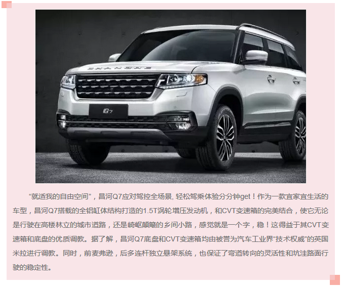 憑借全能又多變的產(chǎn)品力優(yōu)勢,昌河Q7不僅能夠滿足時下消費者注重的個性化需求,又能完美兼顧不同生活場景的應(yīng)用,用其全適應(yīng)、全場景的定位拓展了人們對于SUV認(rèn)知的邊界,展示了SUV車型未來的發(fā)展風(fēng)向,那就是人、車、生活的完美統(tǒng)一和無縫結(jié)合?!熬瓦m我的”Q7,就是我的生活,這就是昌河Q7想要帶給互聯(lián)網(wǎng)時代下年輕一代的未來移動生活方式。