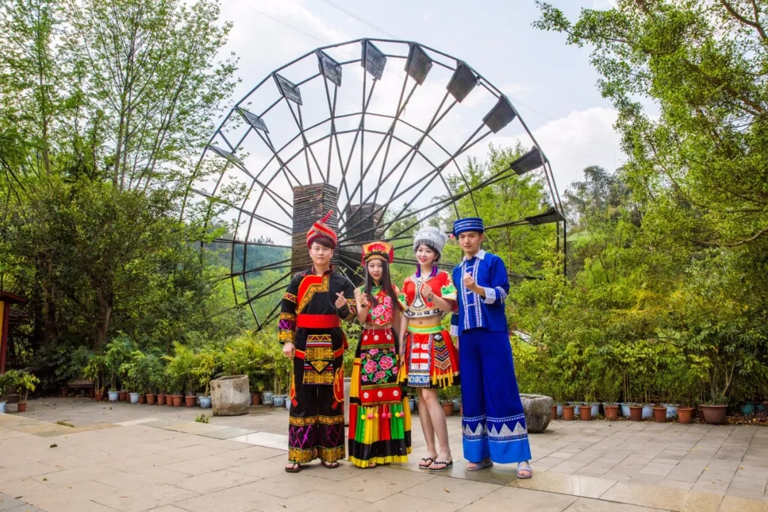 看完油菜花田,我們循著明代著名旅行家徐霞客的足跡來到多依河畔,換上少數(shù)民族服飾,坐在竹筏上漂流,體驗純正的民族風情。古老而巨大的圓盤水車,嘎吱嘎吱地轉動著,仿佛把我們帶進古老的年代。