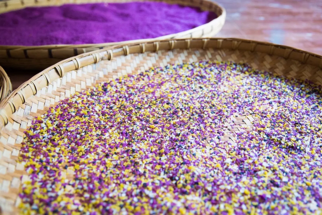 聽說這里的花米飯利用純天然植物染成,不添加任何色素,向老奶奶詢問,她耐心地向我們介紹了幾種植物:楓香葉、染飯花、紅蘭草、紫蘭草。這些植物不但能改變糯米的顏色,而且還有良好的藥物作用。李時珍的《本草綱目》中提到,五色花米飯中,用來染黑顏色的"楓香葉",人食之,能"堅筋骨、益腸胃、補髓";用來染黃顏色的"染飯花"具有清熱涼血等作用;用來染紅顏色的"紅蘭草"具有生血的作用。而用來染紫色的"紫蘭草",在布依族民間療法中,單方熬湯服用,能治療糖尿病、高血壓、頭暈等癥。