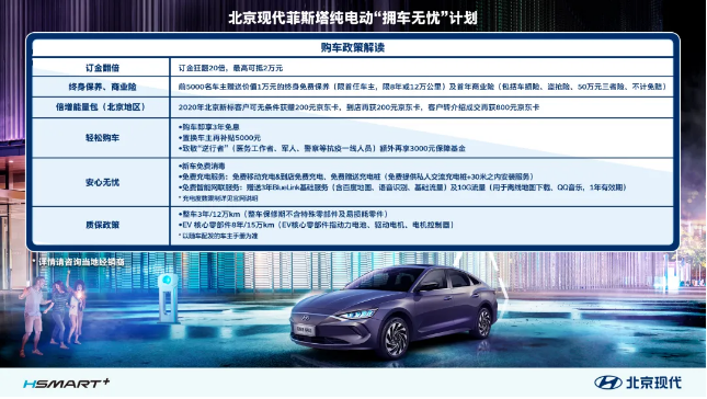 2020年3月10日,北京現(xiàn)代舉行菲斯塔純電動(dòng)——純電時(shí)尚魅力座駕線(xiàn)上發(fā)布會(huì),現(xiàn)場(chǎng)公布國(guó)補(bǔ)后售價(jià)為17.38-19.88萬(wàn)元,并推出“擁車(chē)無(wú)憂(yōu)”的購(gòu)車(chē)政策。消費(fèi)者購(gòu)買(mǎi)菲斯塔純電動(dòng)可在國(guó)補(bǔ)后售價(jià)的基礎(chǔ)上再享受3萬(wàn)元的高額購(gòu)車(chē)禮遇,以及3年免息、超值置換補(bǔ)貼等多重福利。