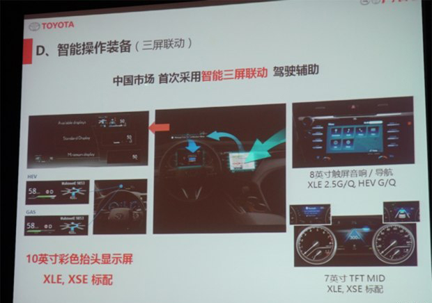 配置方面,根據(jù)早前獲得的車(chē)型信息介紹圖片,新車(chē)將全系標(biāo)配電子駐車(chē)系統(tǒng)、自動(dòng)駐車(chē)、全車(chē)10個(gè)SRS氣囊(主/副駕駛席氣囊、前排側(cè)氣囊、前排膝部氣囊、側(cè)氣簾、后排側(cè)氣囊)。此外,在XLE、XSE兩款車(chē)型中將標(biāo)配10英寸彩色抬頭顯示屏、7英寸TFT MID行車(chē)電腦等配置。同時(shí),在HEV車(chē)型中將配備自動(dòng)化性控制系統(tǒng)(AGC:Auto Glide Control)以及采用了全新開(kāi)發(fā)的Hyper Prime Nicke電池等。值得一提的是,未來(lái)根據(jù)車(chē)型配置的不同還將配備全景監(jiān)控系統(tǒng)(PVM)和并線盲點(diǎn)監(jiān)測(cè)系統(tǒng)(BSM)配置。