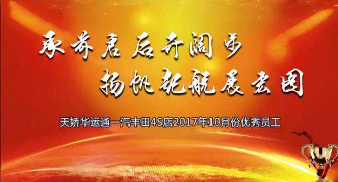 銀色的十月已過去,輝煌的十一月悄然來臨,時(shí)間晃晃而過已是2017年11月11日,天嬌華運(yùn)通一汽豐田4S店每月一次的總結(jié)優(yōu)秀員工表彰大會如期而至。