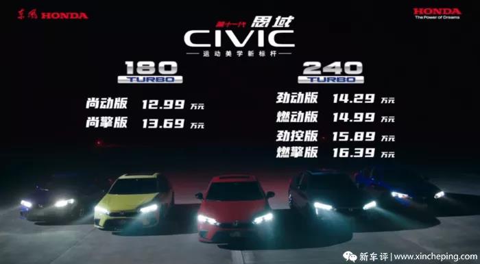 說思域是運(yùn)動(dòng)家轎的天花板,應(yīng)該沒有太多異議吧。當(dāng)然,我們這個(gè)結(jié)論是在過去的產(chǎn)品身上得出來的,接下來思域要進(jìn)入第十一代車型的時(shí)代,而因?yàn)樗膶?shí)力進(jìn)化的更強(qiáng)了,所以我認(rèn)為很有可能,這一次是真正的王者歸來。9月24日,第十一代思域正式上市,全系推出的1.5T兩種功率版本共6種車型,其中兩款運(yùn)動(dòng)車型,指導(dǎo)價(jià)12.99-16.39萬元。全系起售價(jià)相比老款略高了1萬,但三缸換四缸,更強(qiáng)的動(dòng)力性能、標(biāo)配10安全氣囊、倒車影像、無鑰匙進(jìn)入/啟動(dòng),更強(qiáng)的數(shù)字化能力,都讓人覺得,這錢加得值。