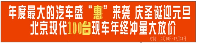 12月份是購車的好時機,12月份也是廠家促銷力度最大的時候,時值圣誕與元旦雙節(jié)來臨之際,在這個時候為自己為家人購置一輛心愛的車會是一個不錯的選擇。為了慶祝圣誕元旦的到來,北京現(xiàn)代4S店準(zhǔn)備了無數(shù)雙節(jié)大禮送個廣大市民,只要來到我們店,禮品送給您??!同時為了完成北京現(xiàn)代年底銷量任務(wù),我們將實行零利潤銷售沖量大放價,優(yōu)惠程度超乎您的想象,想要買車的您還在等什么呢!