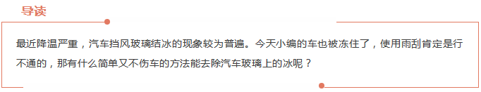 目前市場上有一種噴霧除冰雪劑,它是專為結(jié)冰的車窗和雨刮器解凍的高速防冰噴灑濃縮液,不損傷車身表面,可防止再次結(jié)冰和弄臟。在零下30℃以下的低溫時,可輕易地除去冰雪,同時,它還能防止擋風(fēng)玻璃和積水部位結(jié)冰,不損傷車身表面,清理后玻璃光潔,不留痕跡。